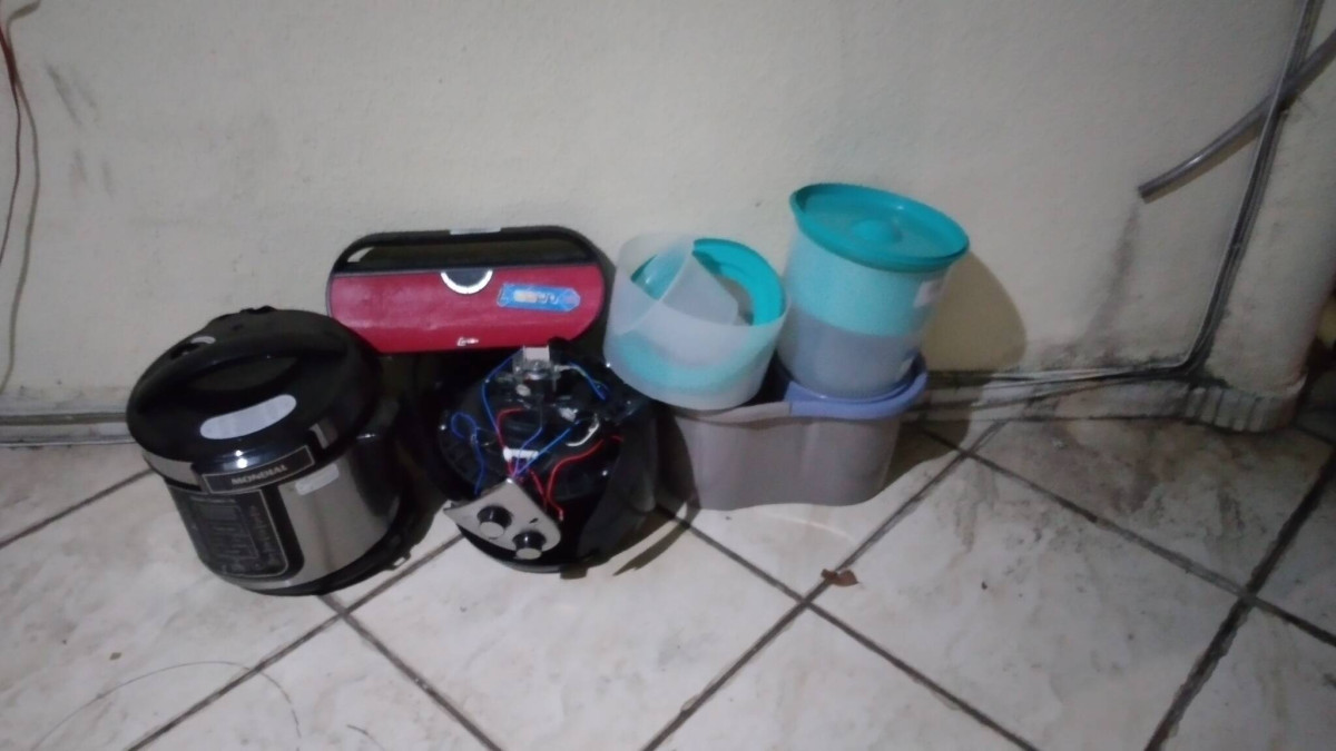 Lote 12 - 05 ITENS SENDO: 02 SUCATAS DE PANELA ELETRICA + 01 RADIO + 01 BALDE DE MOP + 01 FILTRO