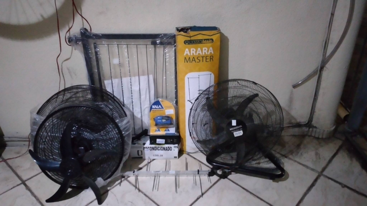 Lote 13 - 07 ITENS SENDO: 01 VENTILADOR (+ PEÇAS AVULÇAS) + 01 PORTÃO PET + 01 ANTENA + 01 ARARA + 01 AUTORADIO + 01 NIVEL A LASER + 01 BOMBA MANUAL