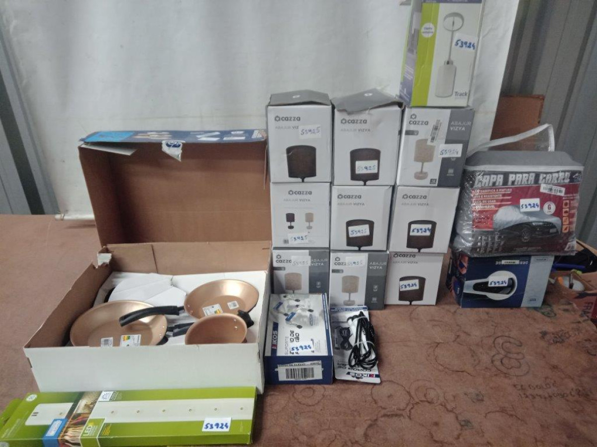Lote 53925 - 16 ITENS SENDO: 09 ABAJURES + 01 APOIO DE FLEXÃO + 01 CAPA AUTOMOTIVA + 01 CONJUNTO DE PANELAS + 01 CORDA + 02 LUMINARIAS + 01 MASSAGEADOR