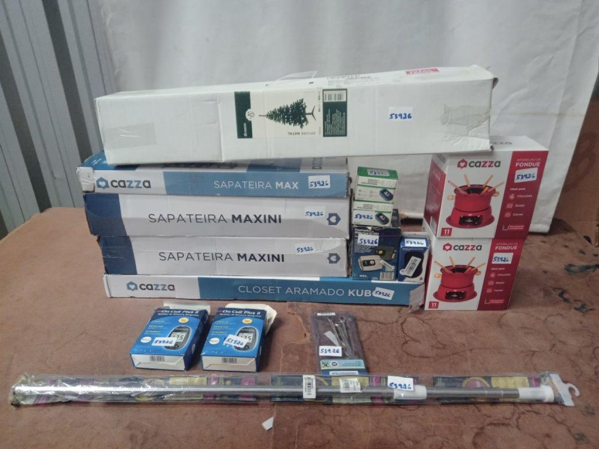 Lote 53926 - 15 ITENS SENDO: 01 ARVORE DE NATAL + 02 CONJUNTOS DE FONDUE + 01 FECHADURA ELETRICA + 01 JOGO DE CHAVE + 02 KITS GLICOSE + 01 MOUSE + 02 OXIMETROS + 01 ROUPEIRO + 03 SAPATEIRAS + 01 VARAL